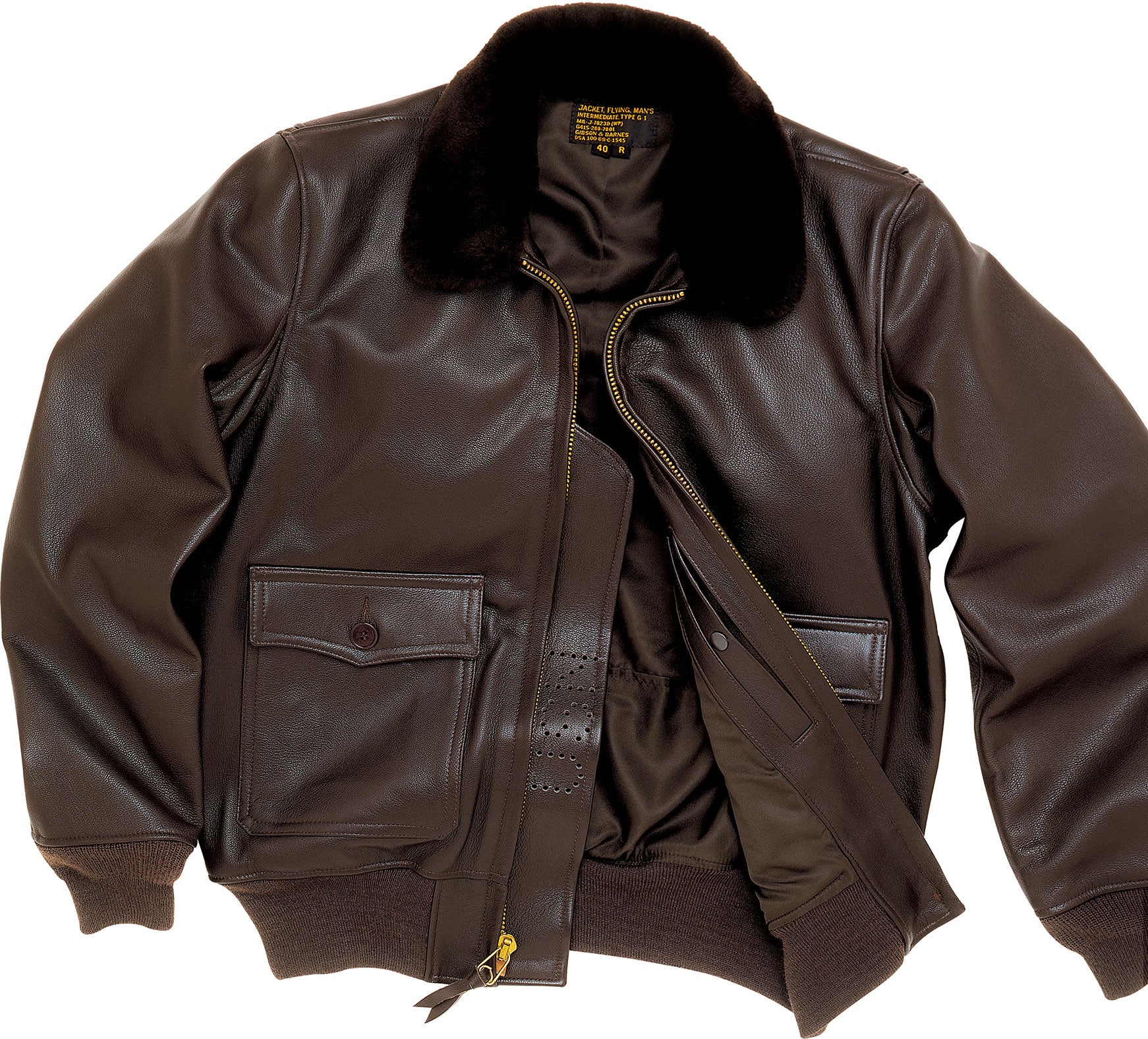 Gibson & Barnes follows the original Navy specifications and patterns for the G-1. We make it from large drum-dyed, semi-aniline goatskins and use genuine mouton (lamb's wool) for the collar, rib knit for the cuffs and waistband, and a heavy solid brass zipper.
